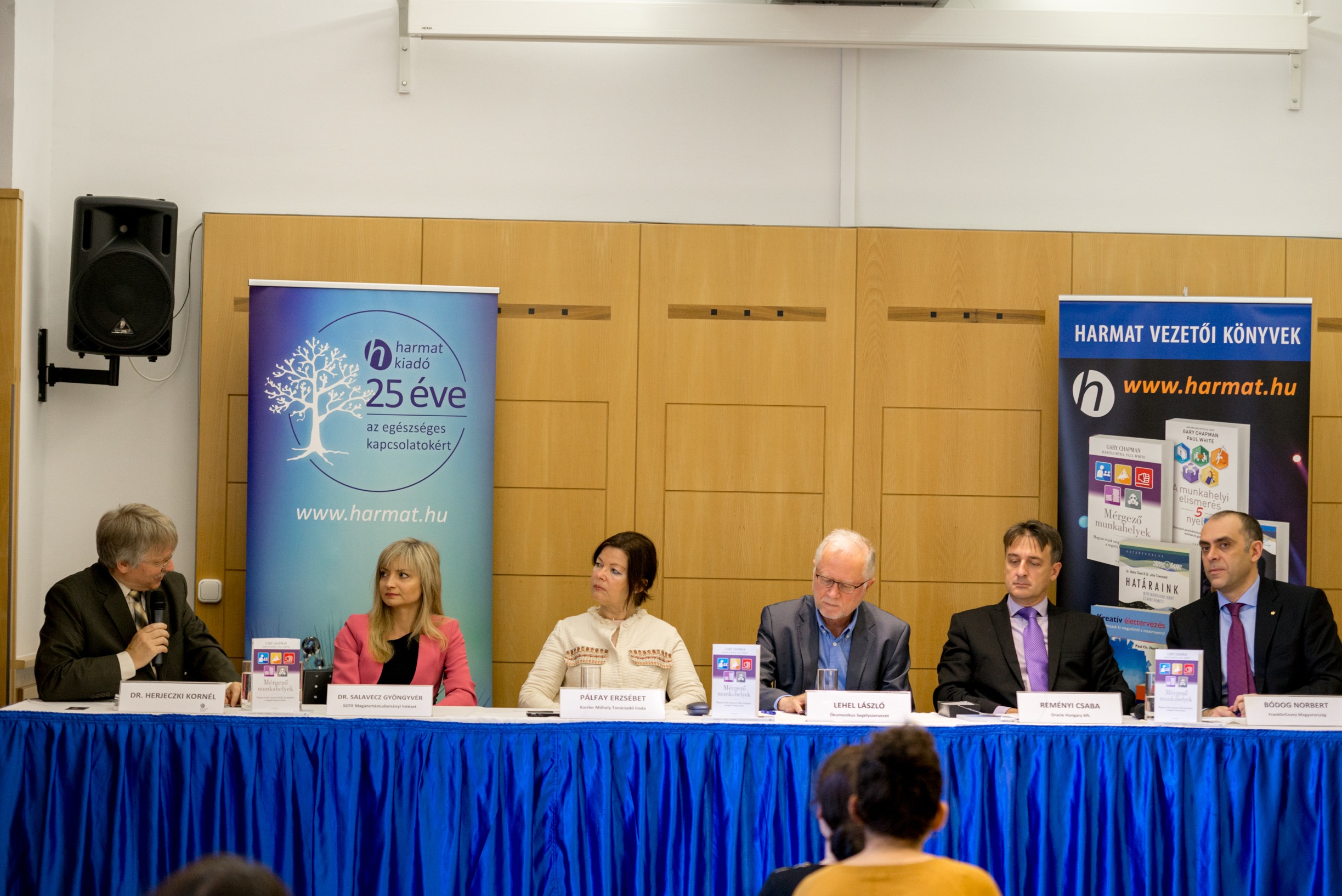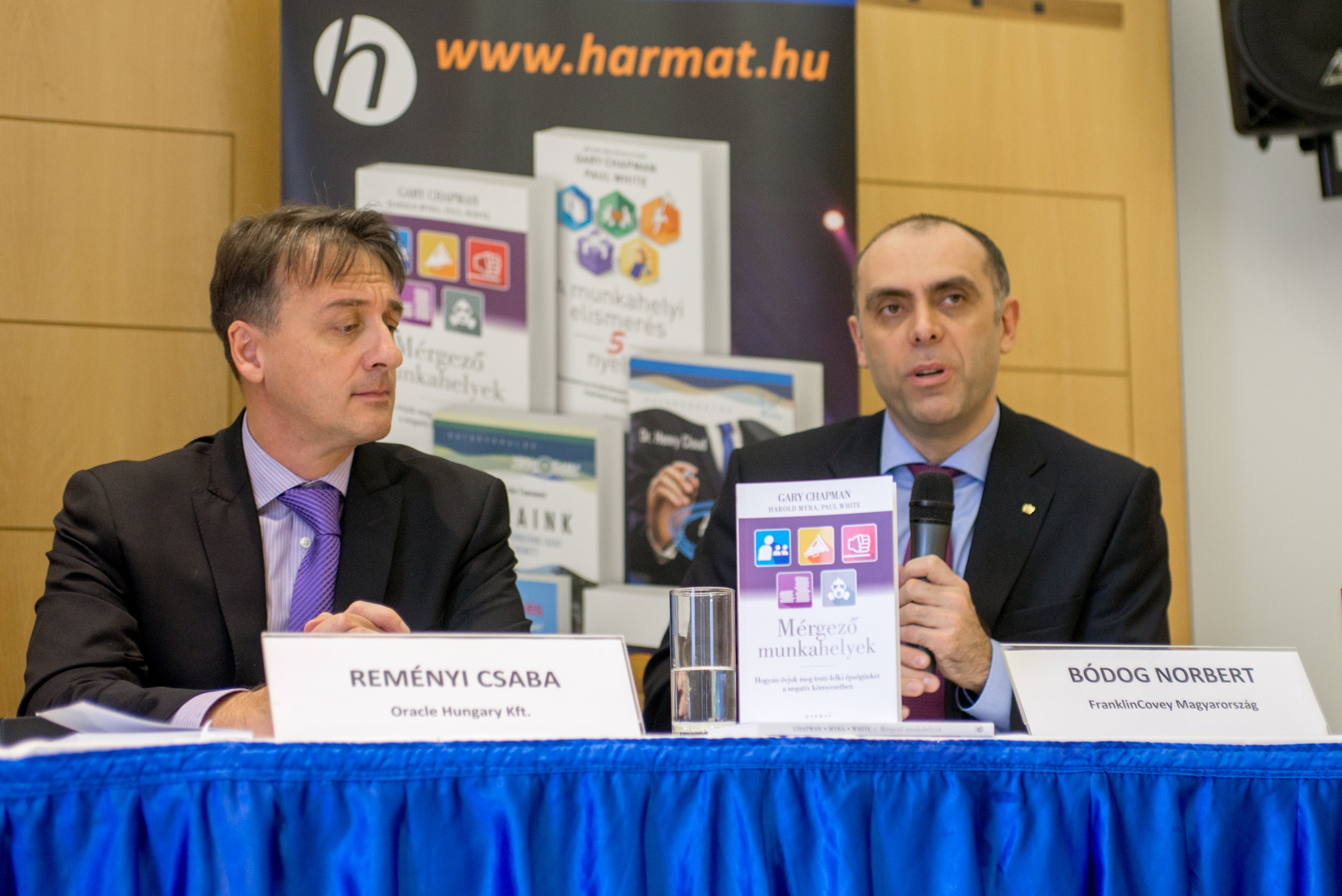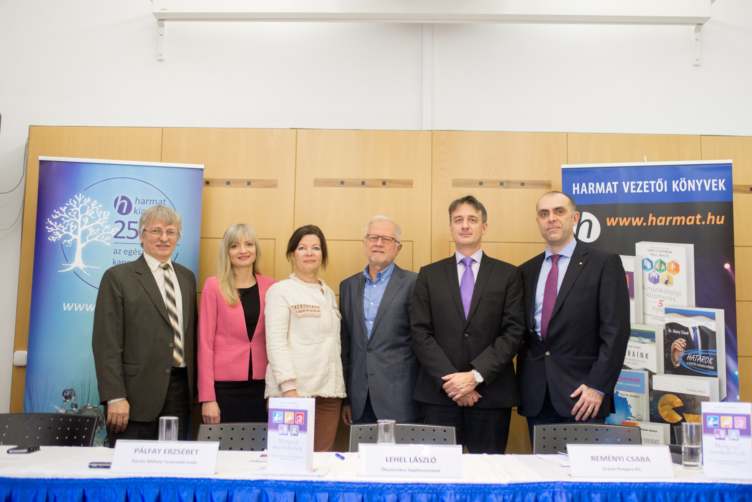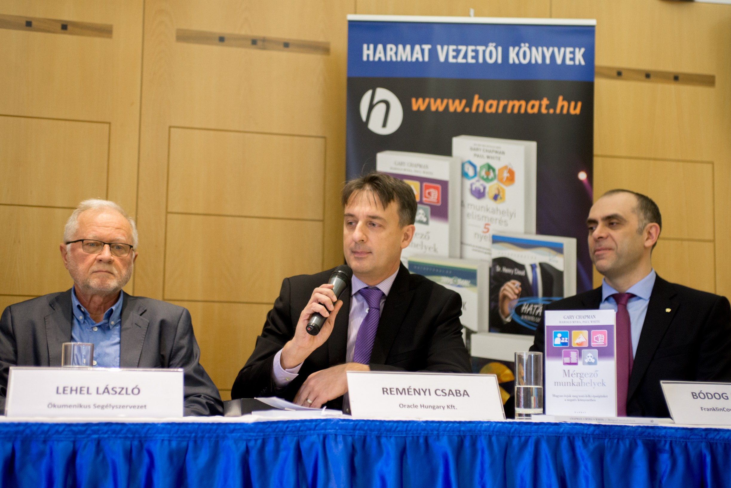 Budapest, 2016. november 22. – A nemzetgazdasági szempontból is komoly figyelmet követelő munkahelyi stressz témájában tartottak ma az Aranytíz Kultúrházban könyvbemutatóval egybekötött sajtóbeszélgetést, amelyen felszólalt többek között Lehel László, az Ökumenikus Segélyszervezet igazgatója, dr. Salavecz Gyöngyvér, a SOTE Magatartástudományi Intézet Munkahelyi Stressz Kutatócsoportjának tagja és Reményi Csaba, az Oracle Hungary Kft. ügyvezetője.