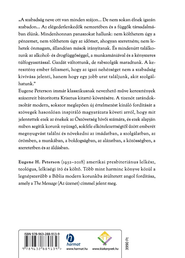 A Biblia megszólító erejű fordításáról ismert amerikai lelkész, Eugene Peterson immár klasszikusnak nevezhető műve keresztények százezreit bátorította Krisztus kitartó követésére. A tizenöt  zarándokzsoltár modern, sokszor meglepően új értelmezést kínáló fordítását a szövegek hasonlóan inspiráló magyarázata követi arról, hogy mit jelentettek ezek az énekek az Ószövetség hívői számára, és ezek alapján miben segítik korunk nyüzsgő, sokféle elkötelezettségtől űzött emberét megnyugvást találni és növekedni az imádatban, a szolgálatban, az örömben, a munkában, a boldogságban, az alázatban, a közösségben, a szeretetben és az áldásban.