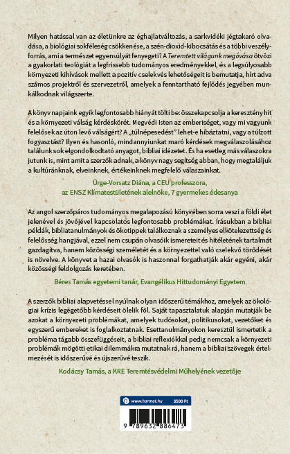 A könyv környezetvédelmi szakember szerzőpárosa a környezetvédelem és a fenntarthatóság kérdéseit vizsgálja, így a klímaváltozás, élelem, biodiverzitás, a népesedés problémáját, hogyan függenek össze a környezetvédelem problémái a fenntartható fejlődés kérdésével, és milyen választ kínál minderre a kereszténység. A fejezetek végén ökotippek adnak ötletet a környezetvédő szemlélet gyakorlati alkalmazásához, valamint bibliai reflexiók és bibliatanulmányok mélyítik el a fejezetben tárgyalt témákat.